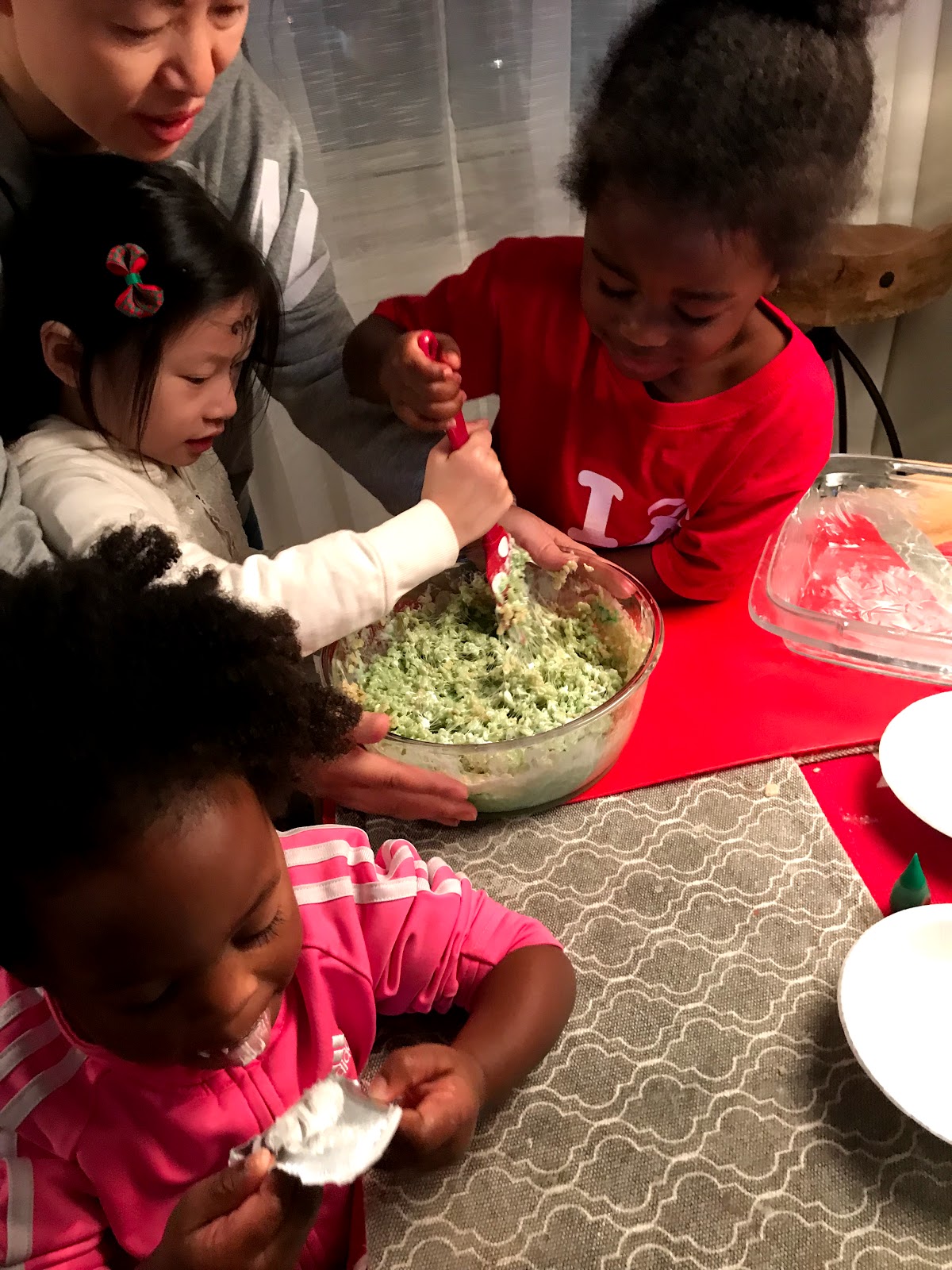 . mainly letting them measure out the ingredients then attempting to mix the cereal into the marshmallow mix. again food coloring (green!) was the secret sauce here. we didn't get to finish this because the rice krispy treats needed time to cool. When they do get chilled, you can dip the top of the squares in chocolate and use an icing pen to make the face and face stithes.